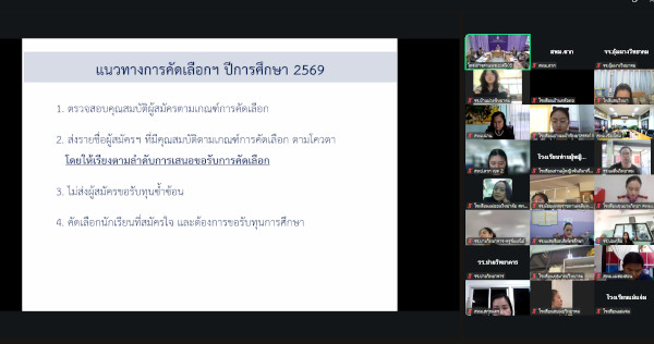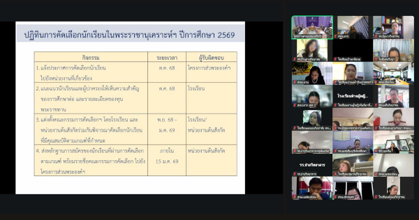 โดยเมื่อวันที่ 29 ตุลาคม พ.ศ. 2568 งานนักเรียนในพระราชานุเคราะห์ โครงการส่วนพระองค์สมเด็จพระกนิษฐาธิราชเจ้า กรมสมเด็จพระเทพรัตนราชสุดา ฯ สยามบรมราชกุมารี จัดประชุมชี้แจงแนวทางการคัดเลือกนักเรียนในพระราชานุเคราะห์ สมเด็จพระกนิษฐาธิราชเจ้า กรมสมเด็จพระเทพรัตนราชสุดา ฯ สยามบรมราชกุมารี ประจำปีการศึกษา 2569 โดยได้หารือและชี้แจงเพื่อทำความเข้าใจเกี่ยวกับคุณสมบัตรของผู้สมัครเข้ารับการคัดเลือกนักเรียนในพระราชานุเคราะห์ ที่จบการศึกษาระดับมัธยมศึกษา เข้าศึกษาต่อในระดับอุดมศึกษา รวมทั้งขั้นตอนในการคัดเลือก ร่วมกับครูผู้รับผิดชอบโครงการนักเรียนในพระราชานุเคราะห์ ระดับมัธยมศึกษา จากโรงเรียนในโครงการตามพระราชดำริ สังกัดกองบัญชาการตำรวจตระเวนชายแดน และสำนักงานคณะกรรมการการศึกษาขั้นพื้นฐาน จำนวน 22 แห่ง ผ่านสื่ออิเล็กทรอนิกส์ (ออนไลน์)