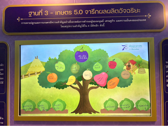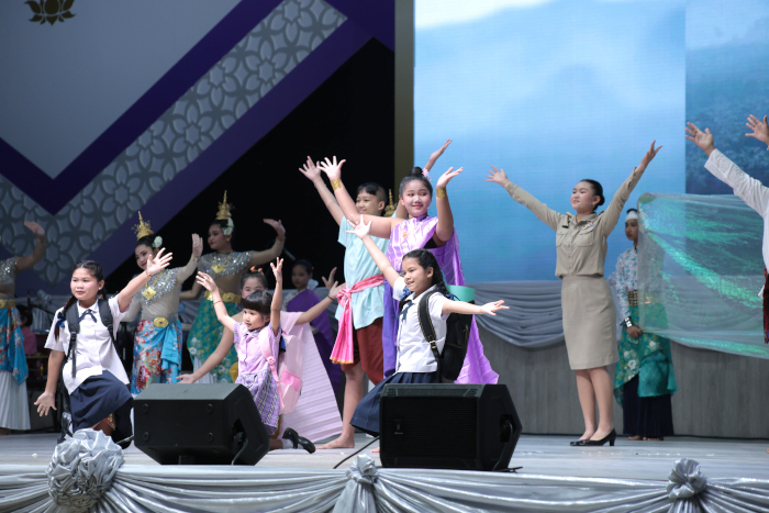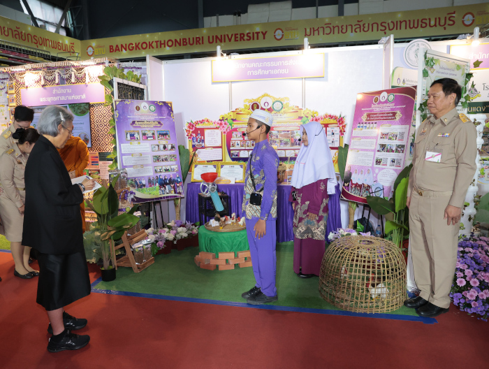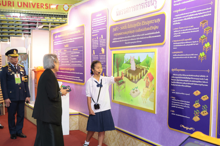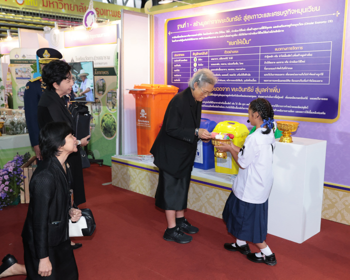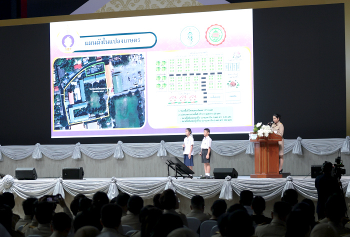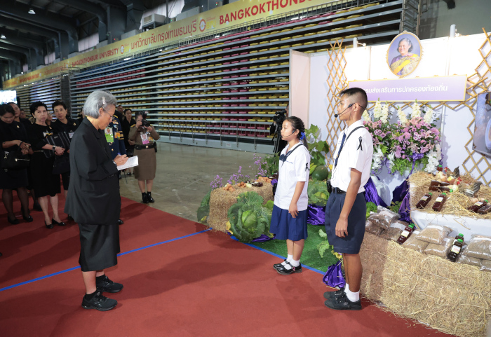 ในการนี้ทอดพระเนตรการแสดงของนักเรียนโรงเรียนบ้านในวง สังกัดองค์การบริหารส่วนจังหวัดระนอง ชุด “นารีรัตนา ปวงประชาร่มเย็น” จากนั้นทอดพระเนตรการนำเสนอผลงานแนวปฏิบัติที่ดีรายด้าน 6 ด้าน ภายใต้หัวข้อ “การเกษตรที่เป็นมิตรต่อสิ่งแวดล้อม” ของสถานศึกษาในโครงการตามพระราชดำริ 7 หน่วยงาน ได้แก่ กรมส่งเสริมการปกครองท้องถิ่น กองบัญชาการตำรวจตระเวนชายแดน สำนักงานคณะกรรมการการศึกษาขั้นพื้นฐาน กรมส่งเสริมการเรียนรู้ สำนักงานคณะกรรมการส่งเสริมการศึกษาเอกชน สำนักงานพระพุทธศาสนาแห่งชาติ และสำนักการศึกษา กรุงเทพมหานคร พร้อมกันนี้ทอดพระเนตรนิทรรศการฐานการเรียนรู้ และนิทรรศการผลงานนักเรียน หัวข้อ “การเกษตรที่เป็นมิตรต่อสิ่งแวดล้อม” จากสถานศึกษา 7 หน่วยงานด้วย