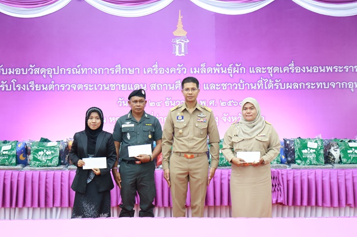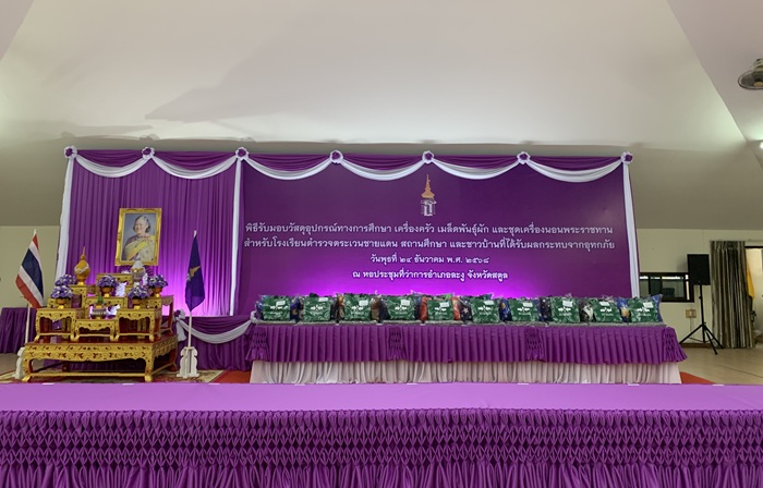 โดยในวันที่ 24 ธันวาคม พ.ศ. 2568 นายคณิต คงช่วย ผู้ว่าราชการจังหวัดสตูล เป็นประธานในพิธีมอบสิ่งของพระราชทาน ให้แก่สถานศึกษาและประชาชนที่ประสบเหตุอุทกภัย ประกอบด้วย สถานศึกษา 21 แห่ง มัสยิด 2 แห่ง รวมทั้งประชาชนพื้นที่อำเภอละงู จำนวน 100 คน ในการนี้ นายอภิสิทธิ์ พึ่งพร ผู้อำนวยการโครงการส่วนพระองค์สมเด็จพระกนิษฐาธิราชเจ้า กรมสมเด็จพระเทพรัตนราชสุดา ฯ สยามบรมราชกุมารี พร้อมด้วยหัวหน้าส่วนราชการในพื้นที่ และผู้แทนหน่วยงานที่เกี่ยวข้อง เข้าร่วมในพิธี รวมจำนวน 160 คน ณ หอประชุมที่ว่าการอำเภอละงู จังหวัดสตูล