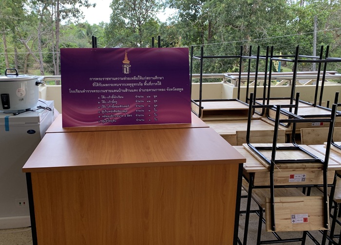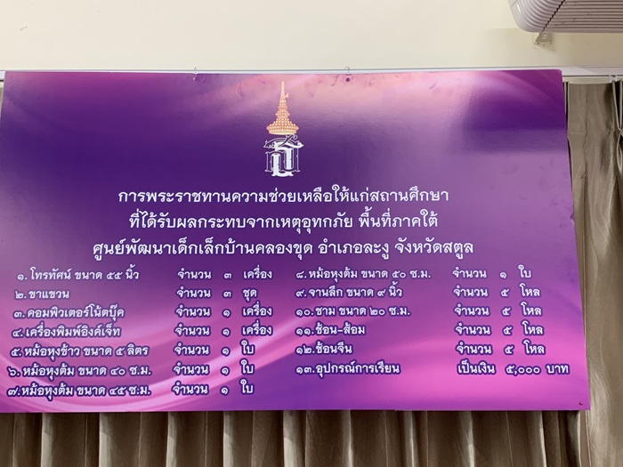 ด้วยทรงห่วงใยนักเรียนและประชาชนที่ได้รับผลกระทบ จึงทรงพระกรุณาโปรดเกล้าฯ พระราชทานหนังสือแบบเรียน สื่อการสอน โทรทัศน์พร้อมขาแขวน คอมพิวเตอร์โน้ตบุ๊ค โต๊ะ-เก้าอี้ ของนักเรียน และครู ชุดเครื่องนอนของเด็กนักเรียนและเครื่องครัว ให้แก่โรงเรียนตำรวจตระเวนชายแดน และสถานศึกษาที่ได้รับผลกระทบ พระราชทานเมล็ดพันธุ์ผักและชุดเครื่องนอน จำนวน 1,000 ชุด ให้แก่ประชาชนที่ประสบอุทกภัยในอำเภอละงู จำนวน 3 ตำบล คือ ตำบลน้ำผุด ตำบลเขาขาว และตำบลละงู และพระราชทานเงินสำหรับซ่อมแซมมัสยิดนูรุลมูบีล และมัสยิดบ้านนาข่าใต้ เพื่อบรรเทาความเดือดร้อนและเป็นขวัญกำลังใจให้แก่ผู้ประสบภัยให้สามารถดำรงชีวิตได้ในเบื้องต้น