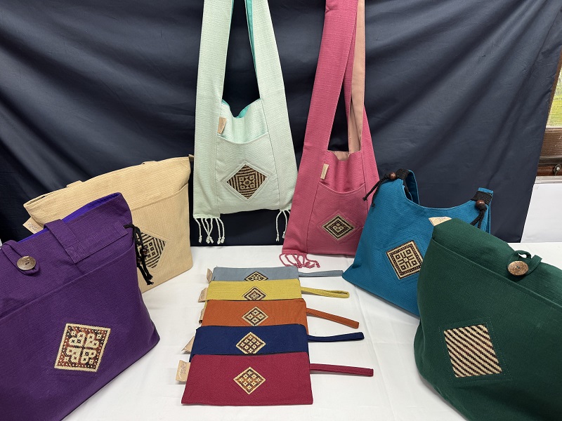 - กระเป๋าผ้าแต่งหญ้าสามเหลี่ยม ตัวกระเป๋าเป็นผ้าฝ้ายทอตัดเป็นกระเป๋ารูปแบบต่างๆ ตกแต่งด้วยแผ่นสานหญ้าสามเหลี่ยม โดยแผ่นสานหญ้าสามเหลี่ยมทำมาจากต้นก้านตองและต้นหญ้าสามเหลี่ยม นำมาสานเป็นลวดลายต่างๆ