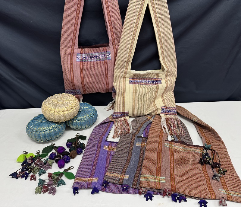 ผลิตภัณฑ์ กระเป๋าผ้า เช่น กระเป๋าผกาเพ็ชร กระเป๋าเพลินเพ็ชร กระเป๋ากุริมด้นมือ กระเป๋าชายครุย และกระเป๋านกฮูก