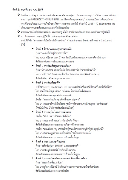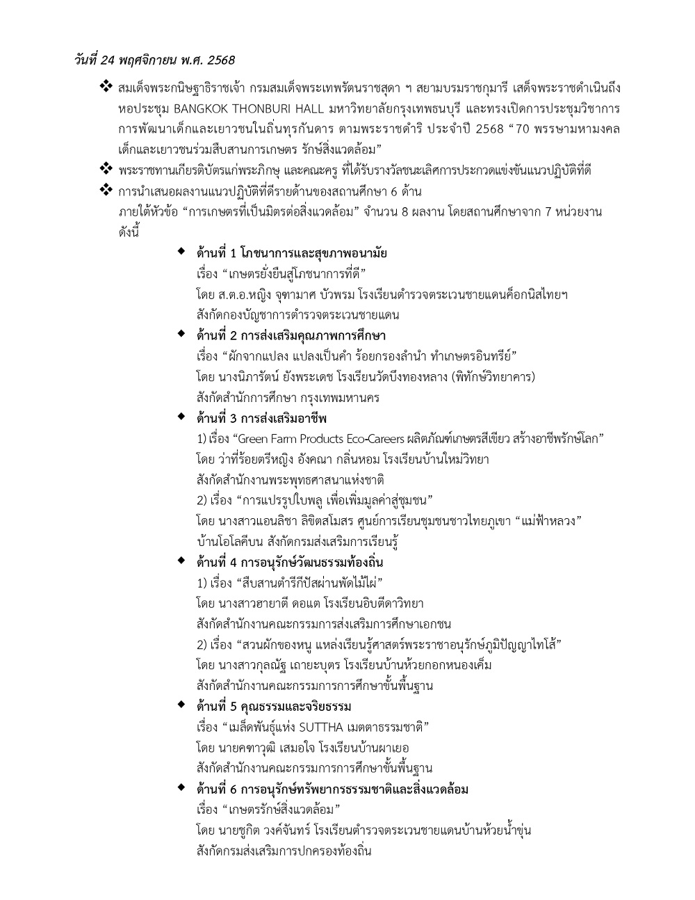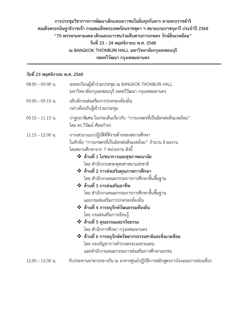 โครงการส่วนพระองค์สมเด็จพระกนิษฐาธิราชเจ้า กรมสมเด็จพระเทพรัตนราชสุดา ฯ สยามบรมราชกุมารี ร่วมกับหน่วยงานสถานศึกษาในโครงการตามพระราชดำริ จัดการประชุมวิชาการการพัฒนาเด็กและเยาวชนในถิ่นทุรกันดาร ตามพระราชดำริ สมเด็จพระกนิษฐาธิราชเจ้า กรมสมเด็จพระเทพรัตนราชสุดา ฯ สยามบรมราชกุมารี ประจำปี 2568 “70 พรรษามหามงคล เด็กและเยาวชนร่วมสืบสานการเกษตร รักษ์สิ่งแวดล้อม” ระหว่างวันที่ 23-24 พฤศจิกายน พ.ศ. 2568 ณ มหาวิทยาลัยกรุงเทพธนบุรี กรุงเทพมหานคร ซึ่งการจัดประชุมครั้งนี้นับเป็นครั้งที่ 11 มีกรมส่งเสริมการปกครองท้องถิ่น เป็นเจ้าภาพหลักในการจัดงาน โดยมีวัตถุประสงค์เพื่อเผยแพร่ พระราชกรณียกิจด้านการศึกษาและการพัฒนาเด็กและเยาวชนในถิ่นทุรกันดาร ตามพระราชดำริ แก่สาธารณชน รวมทั้งบุคลากรทางการศึกษาและผู้ปฏิบัติงานโครงการตามพระราชดำริได้มีโอกาสแลกเปลี่ยนความคิดประสบการณ์ร่วมกัน เพื่อพัฒนาแนวคิดและร่วมกันดำเนินงานให้บรรลุผลตามเป้าหมาย