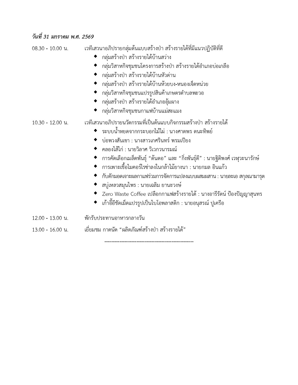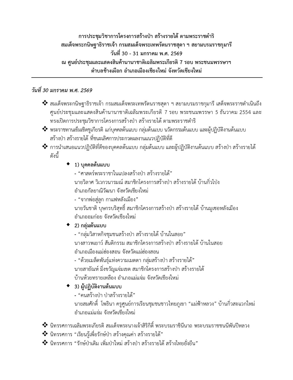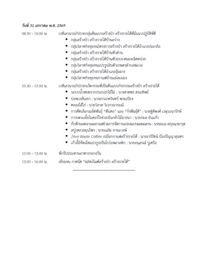 โครงการส่วนพระองค์สมเด็จพระกนิษฐาธิราชเจ้า กรมสมเด็จพระเทพรัตนราชสุดา ฯ สยามบรมราชกุมารี ร่วมกับหน่วยงานที่เกี่ยวข้อง จัดการประชุมวิชาการโครงการสร้างป่า สร้างรายได้ ตามพระราชดำริ สมเด็จพระกนิษฐาธิราชเจ้า กรมสมเด็จพระเทพรัตนราชสุดา ฯ สยามบรมราชกุมารี “13 ปี พระเมตตา สร้างป่า สร้างรายได้ สร้างถิ่นไทยให้เข้มแข็ง” ระหว่างวันที่ 30-31 มกราคม พ.ศ. 2569 ณ ศูนย์ประชุมและแสดงสินค้านานาชาติเฉลิมพระเกียรติ 7 รอบ พระชนมพรรษา 5 ธันวาคม 2554 อำเภอเมืองเชียงใหม่ จังหวัดเชียงใหม่ โดยมีกรมส่งเสริมการเรียนรู้ เป็นเจ้าภาพหลักในการจัดงาน สำหรับวัตถุประสงค์ของการประชุมเพื่อเผยแพร่แนวทางการดำเนินงานตามพระราชดำริ และเผยแพร่แนวปฏิบัติที่ดี รวมทั้งประสบการณ์การดำเนินงานของเกษตรกร กลุ่มสร้างป่า สร้างรายได้ และผู้ปฏิบัติงานต้นแบบโครงการสร้างป่า สร้างรายได้ รวมทั้งนวัตกรรมสนับสนุนกิจกรรมสร้างป่า สร้างรายได้ เพื่อให้เกษตรกรใช้เป็นแนวทางการดำเนินงานในแต่ละพื้นที่ได้อย่างมีประสิทธิภาพต่อไป โดยมีเจ้าหน้าที่ ครู และเกษตรกรสมาชิกในโครงการสร้างป่า สร้างรายได้ พื้นที่โครงการจังหวัดน่าน เลย เชียงใหม่ ตาก และจังหวัดแม่ฮ่องสอน สังกัดกรมป่าไม้และกรมส่งเสริมการเรียนรู้ รวมทั้งผู้แทนจากกรมการปกครอง มหาวิทยาลัยสุโขทัยธรรมาธิราช และหน่วยงานที่เกี่ยวข้อง เข้าร่วมการประชุม